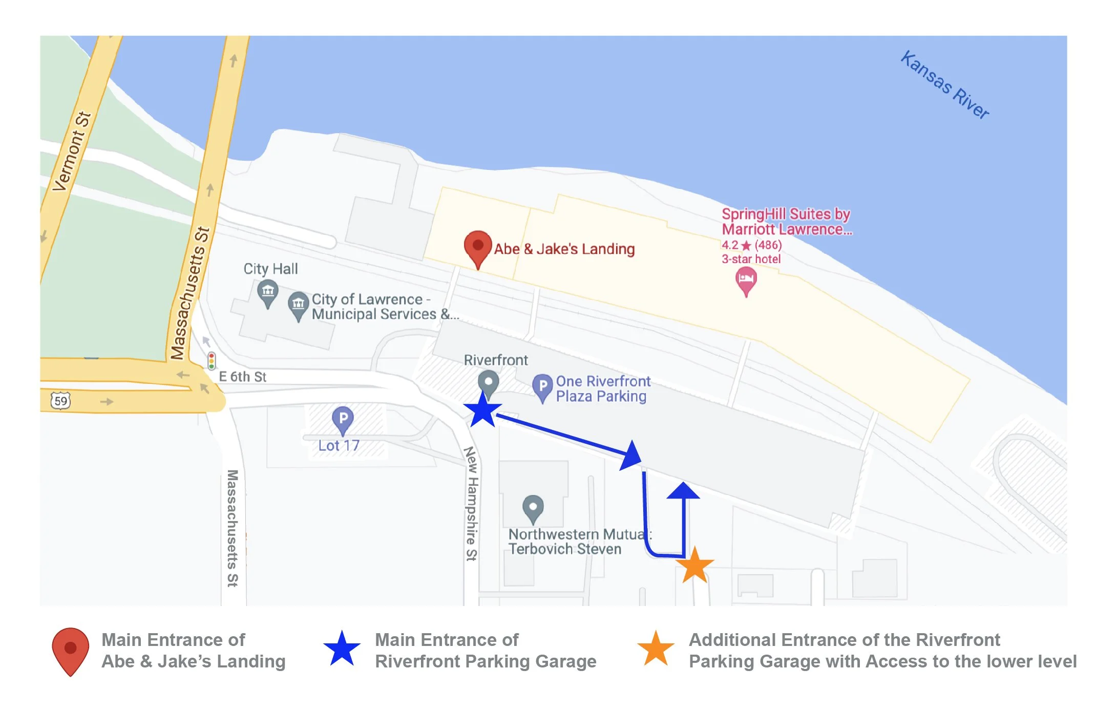 The Main Riverfront Entrance is located on the upper level of the parking lot (blue star on the map). You are able to access the lower parking garage by continuing to drive straight as you enter the parking lot (follow the blue arrows on map below). You will see signs in the parking lot directing you to the lower level of the parking garage. You will then use the stairs that lead you to the upper level. Abe & Jake’s Landing is located right next door.